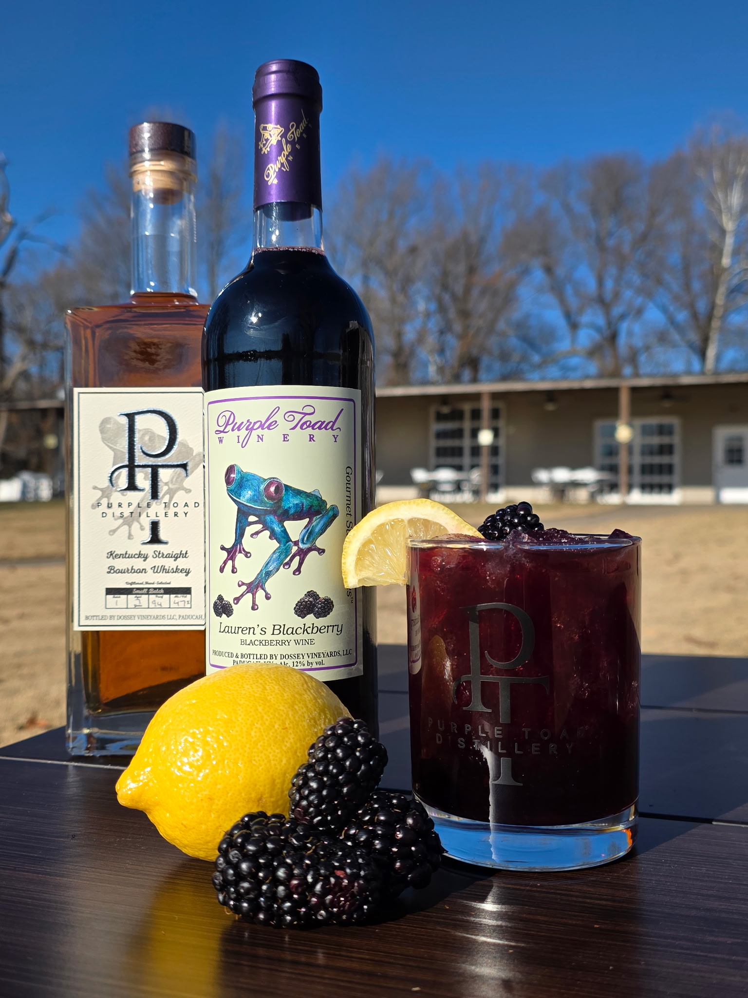 Shake all ingredients with ice. Strain into a Purple Toad glass filled with ice. Garnish with a blackberry and lemon wheel.